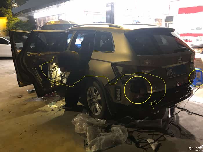 图中黄线就是一个大概走线的线路,要从驾驶侧前门穿过后门再进后备箱把线拉出来,接上左右模块。拆的过程看起来肉疼,“大熊”被“扒皮”,却一声不吭。