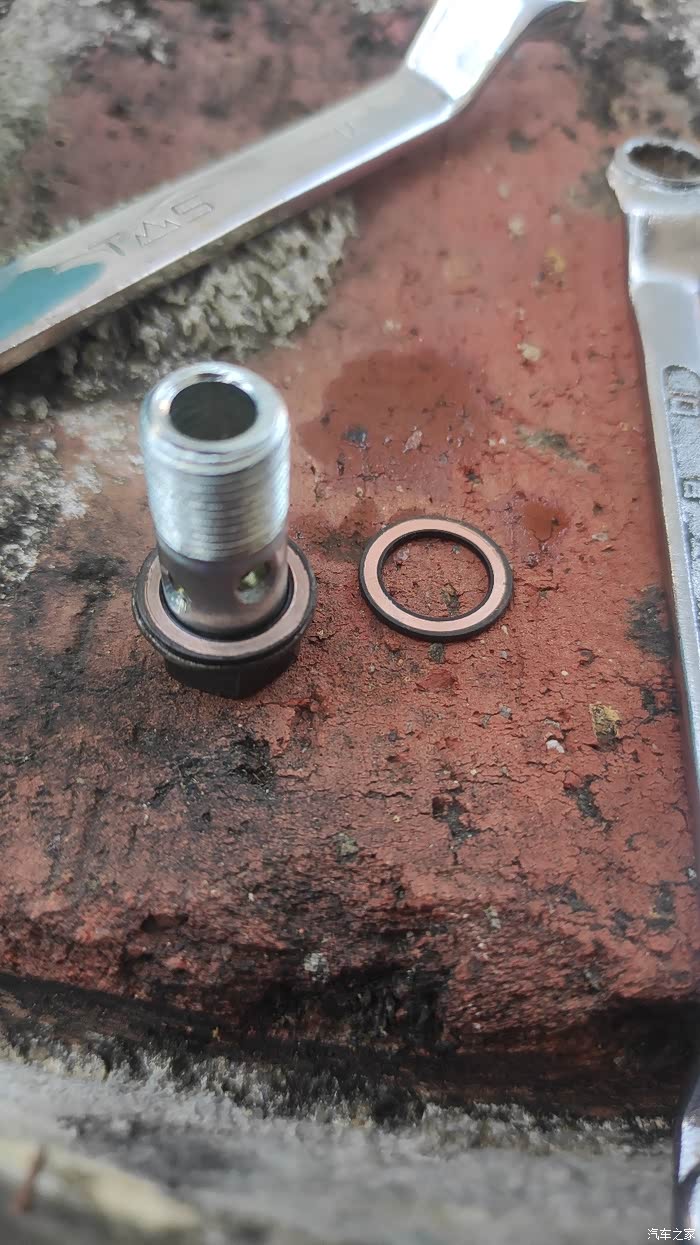 这个是上端螺丝,两个垫圈噢,油管的两端都放垫子。开始我没松下端螺丝,只拆了上端螺丝,后面发现油管扳不动,才去拆下端螺丝,然后下端螺丝松了以后油管就自己摆到一边了,上面的垫圈就掉到下面了,我找了半天,还不好拿。所以应该是先松掉下端螺丝,再卸上端螺丝,这样才好拿出垫圈。切记切记,这就是经验教训。