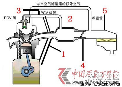 强制通风的过程,在图示4的进气歧管内,发动机点火后为负压,这种负压通过紫色管子将气门室(气门室与曲轴箱是相通的)内的有窜气和油气的混合气体吸出来,同时,气门室又通过红色管子从空气滤清器后部将已经经过过滤的新鲜空气吸入气门室。这样,就完成了一个空气流通的环节:新鲜的空气通过红色管子到气门室,将气门室内的油气通过紫色管子带入进气歧管参与燃烧。(当然,在发动机高速运转的时候,由于窜气较大,窜气会一部分通过紫色管子进入进气歧管加入燃烧,另一部分通过红色管子回到空气滤清器后部,和新鲜空气混合后从节气门进入进气歧管加入燃烧。)