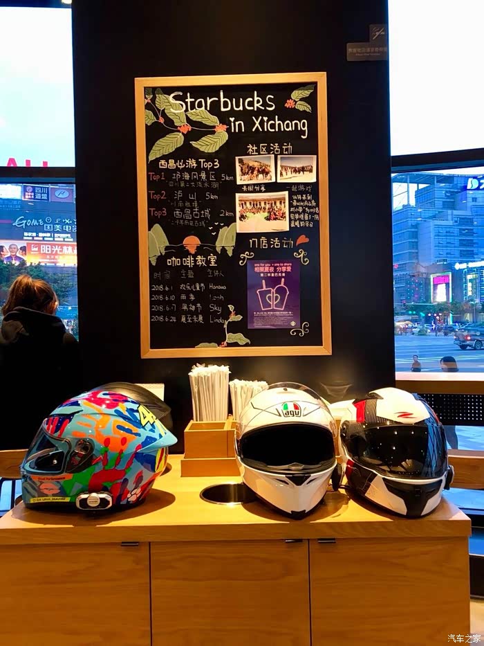 回到西昌后没有下雨,并且有点昏昏儿太阳,气温感觉也还不错,大家都还是觉得西昌才有归属感啊。回到酒店把房开了卸下了装备休息了一会,出发去洗车。毕竟出来那么多天都没有好好给车洗个彻底的澡了,还是对他好点吧,洗个澡去哪呢?大众点评摸出来搜了搜,喝咖啡吧?真的没想到西昌现在城市发展那么好,居然有星爸爸。果断洗了车来到西昌时代广场打卡星巴克,留下咱们成都摩友在西昌的足迹。