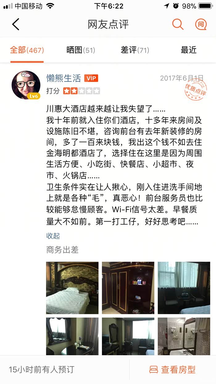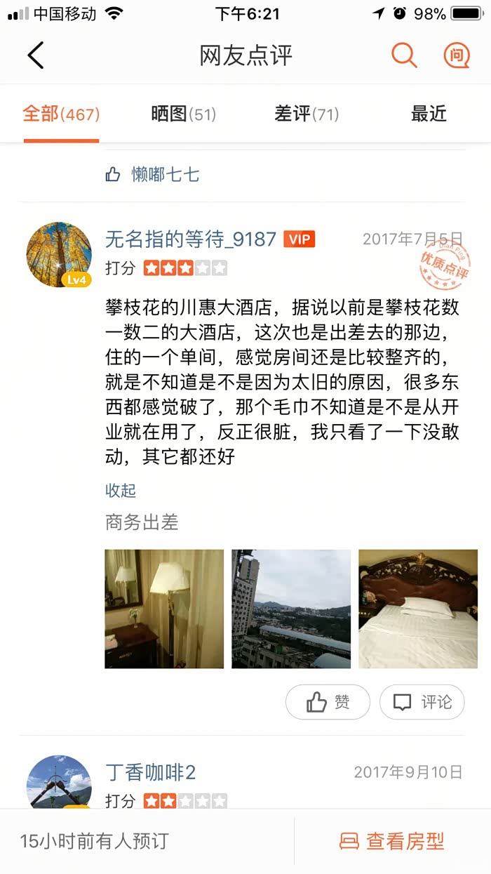 我并不是恶意攻击,只是费解这这种配套和装潢怎么达到酒店的四星级?到底是怎么评上去的?以上是大众点评网友的客观点评,我只是截了图。所以希望车友们出门在外一定要勘察实际环境在定酒店,不然真的很坑。