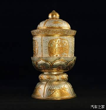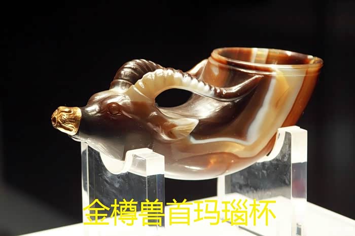 陈列柜里安详躺着的镶金兽首玛瑙杯,盛唐时期的雕工,宛若行云流水,却又尽态极妍。漫长的岁月并没能销磨掉杯上跃动的线条,反而为玛瑙凭空裹上了一层淡淡的包浆,使得西方异兽的情态表情愈发活灵活现、浑然天成。镶金玛瑙的质地在射灯下犹若笼罩着一层薄薄的光晕,通体崇光泛彩。