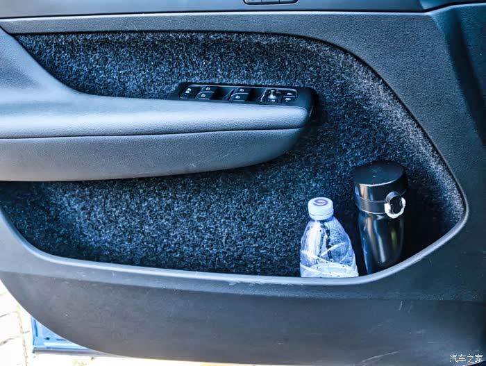 前备箱说完了,我们再看看车内的储物空间,参照物是我自己喝水的水杯和一个矿泉水瓶子。门板的储物空间着实有点惊人,上方的手扣能放下两部iphone max机型。