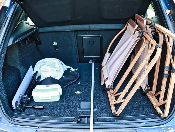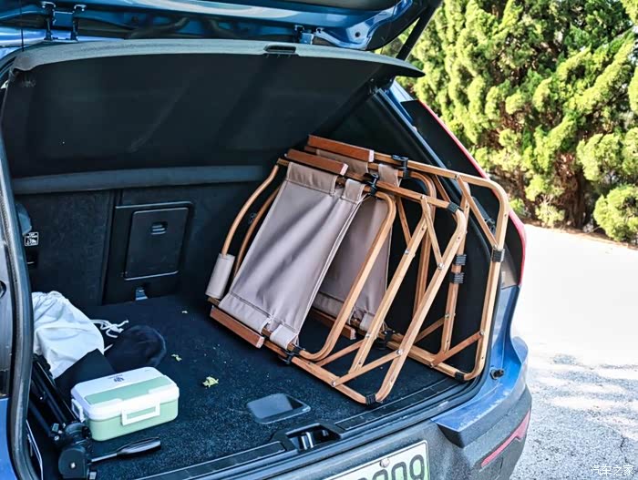 最后我们再看一下后备箱的储物能力如何,最近跟媳妇没事会去公园晒晒太阳,所以车里常备了两把克米特椅子,这两把还是大尺寸的椅子。