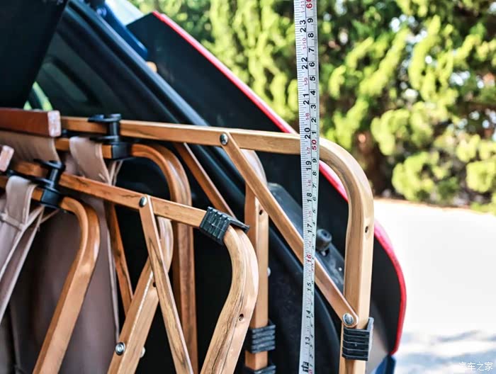 至于后备箱的储物高度,因为有盖板的原因,不太好测量,索性把椅子立起来,作为参照物。