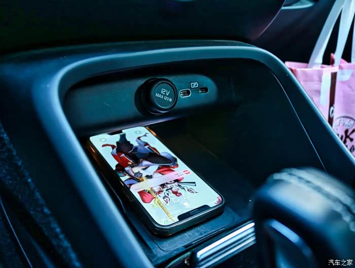 当把前方的储物格,可以放下两部Iphone Pro Max或者横向放一包抽纸,上方有一个12V接口和2个Type-c的充电口,其中一个可以使用Carplay功能。