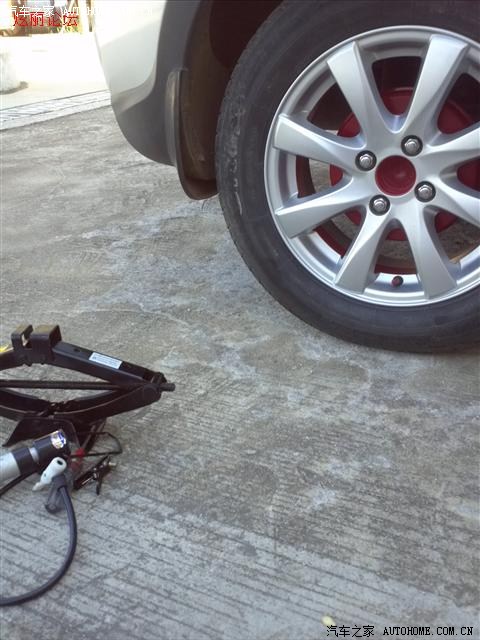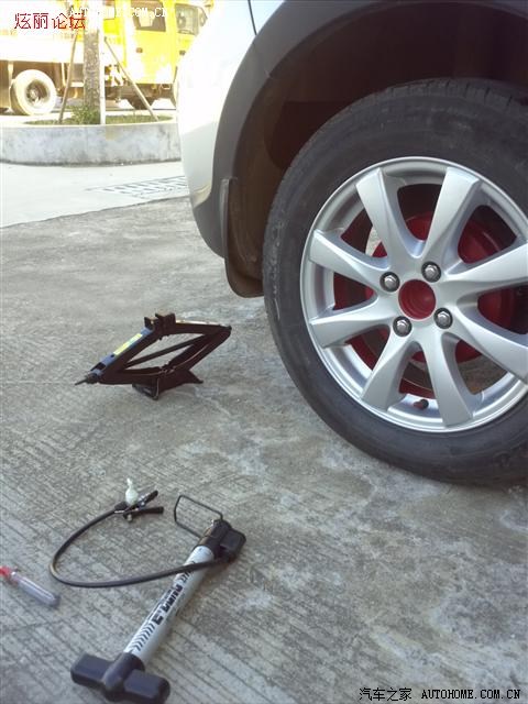 小打气筒,直接打是不行的,必须先用千斤顶把车顶起,找个最低的位置,十几下就把车轮顶离地了。不熟千斤顶使用的可以多点机会练习。