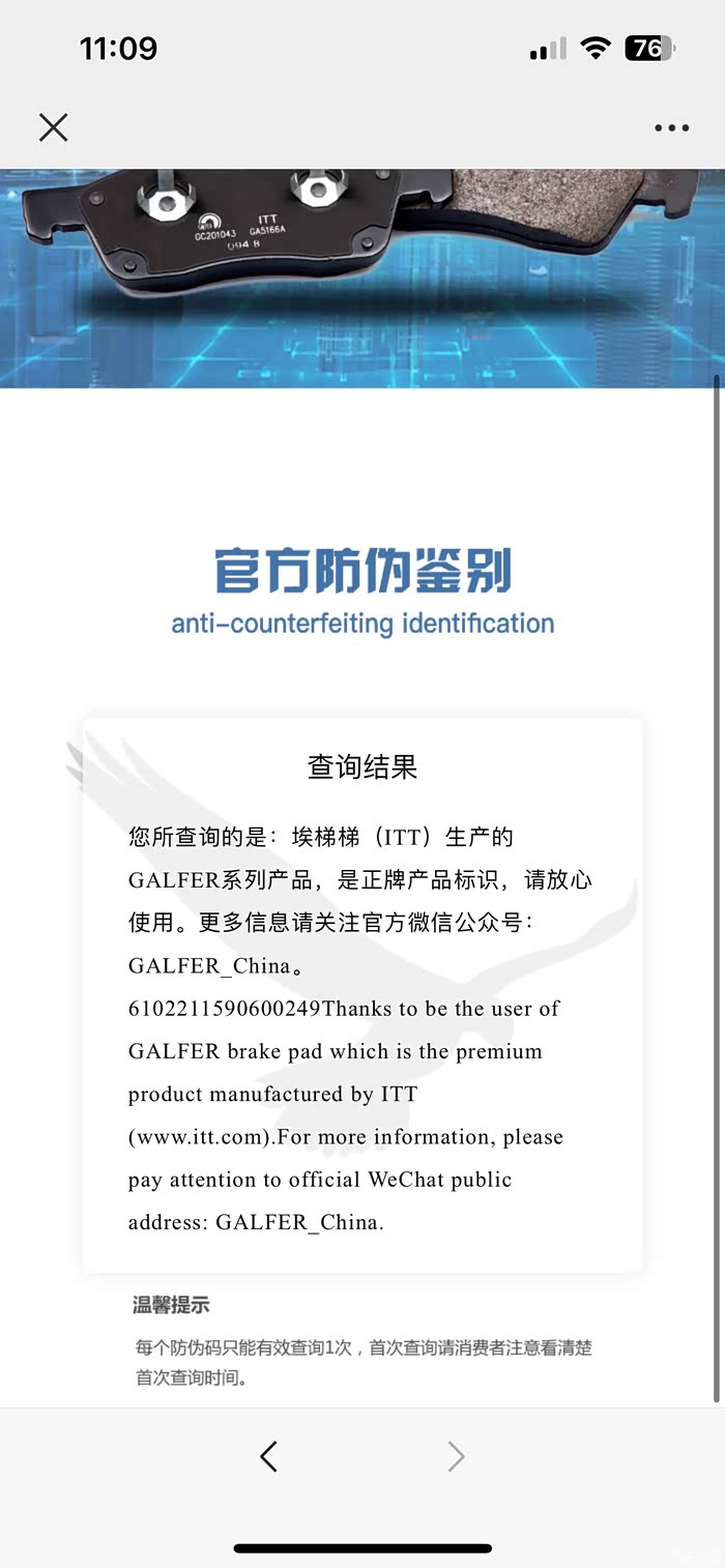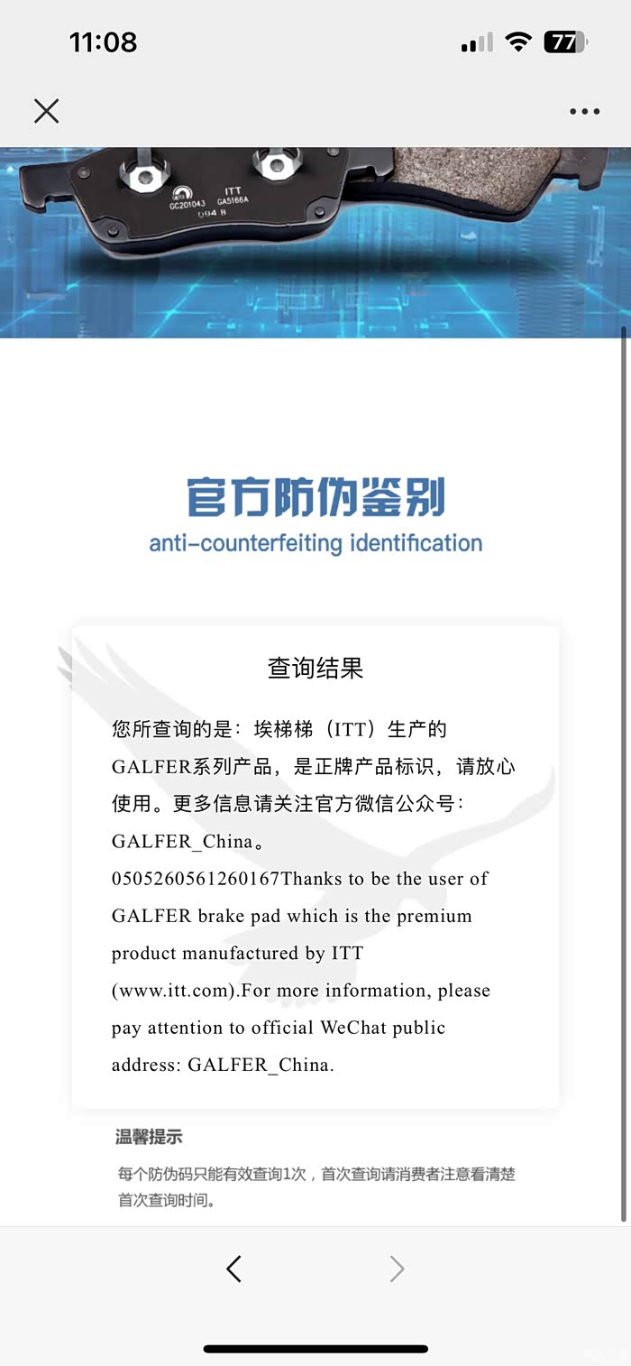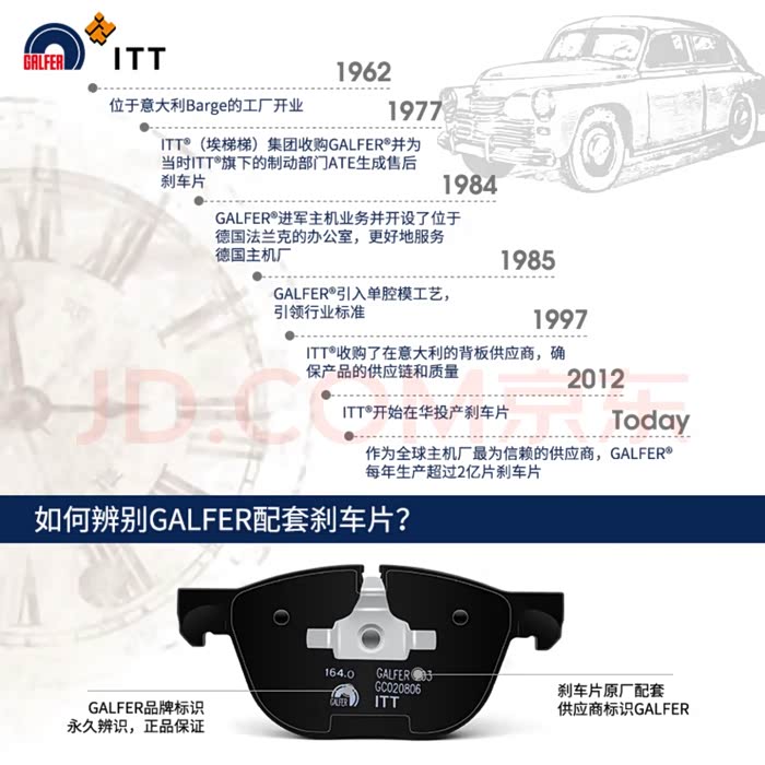首先是GALFER的历史,其隶属于ITT集团,所以有些刹车片上会显示母公司ITT标志
