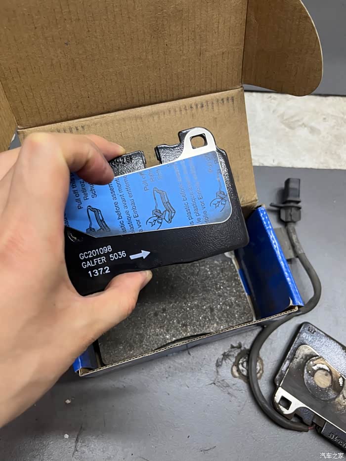 刚拆下来的时候照片,注意看啊,同样的四个圈是厂家,TRW是制动卡钳供应商,Galfer才是刹车片的品牌