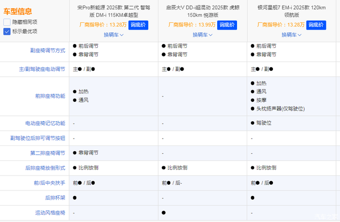 目前看,启辰大V DD-i虎鲸稍微弱一点的是前排座椅功能这方面,没有通风,没有加热,后排也没有杯架,这些对我来说问题不大,当然有肯定是比没有好。我打算星舰7、启辰大V DD-i虎鲸二选一,蹲一波建议。