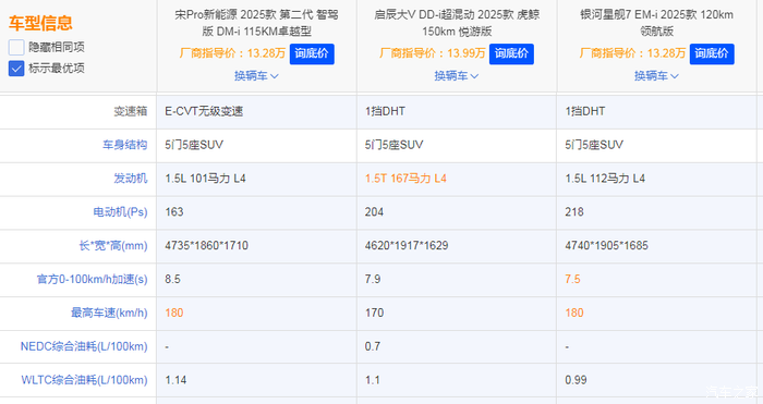 我的预算是14万,重点看的就是这三款,启辰大V DD-i虎鲸悦游版,现在购车2000抵6000,实际购车价13.59万元,比宋pro、吉利银河星舰7 EM-i贵个3000块钱,但续航纯电续航最高,3000块钱差价换30-35公里续航,那肯是很划算的。不过三辆车的配置有差异,所以还是要对比一下,看看到底是不是启辰大V DD-i虎鲸悦游版最划算。发动机方面启辰大V DD-i虎鲸是1.5T,其他两车是1.5L,发动机马力上就差50-60马力,不过零百加速最快的不是启辰大V DD-i虎鲸,而是星舰7,差距不大,就0.4秒,这个应该没有什么感觉了,差距那么小,不知道是不是因为启辰大V DD-i虎鲸电池容量更大,纯电续航里程更长,也就更重一点,所以加速没有能超过星舰7。