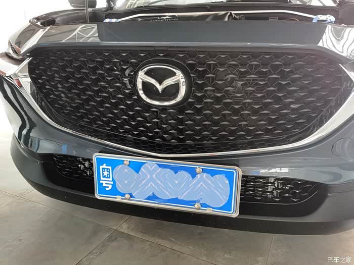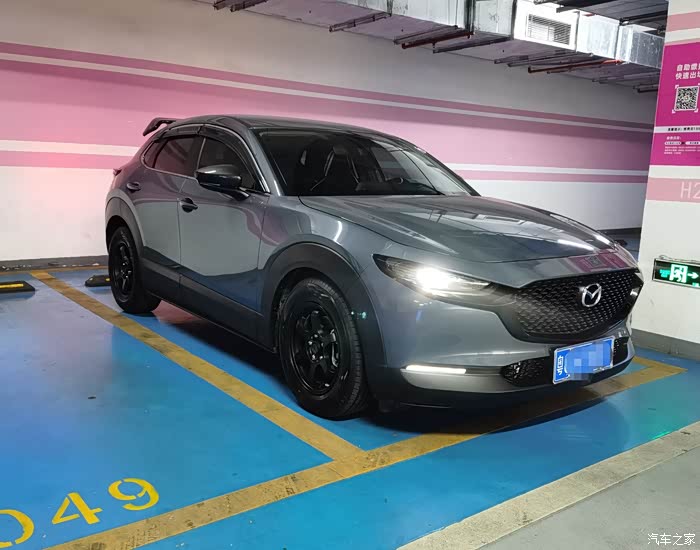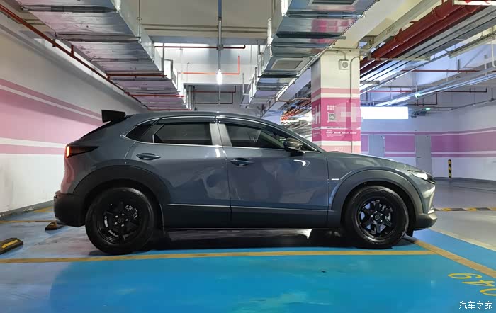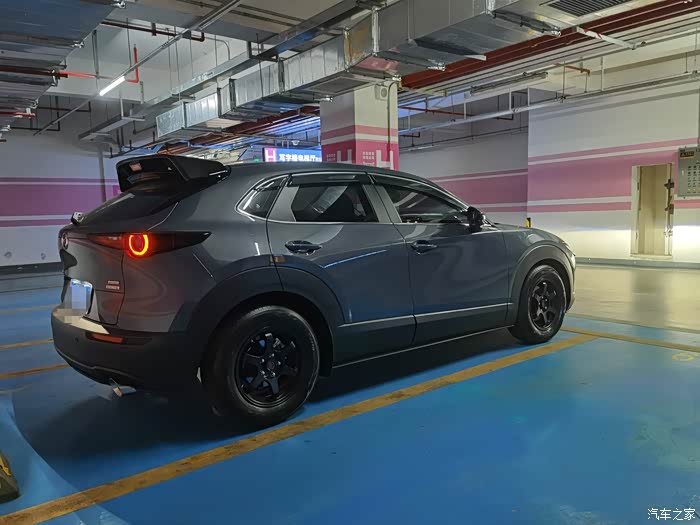 外观部分改装的不多,CX30原来的魂动设计就挺好,所以我自己觉得适当做一些黑化处理就可以了,像黑色轮毂、黑色尾翼、碳纤维款的后视镜盖。还有黑色的前中网饰条没找到质量好的,之前在某宝买回来的都退了,所以我决定买一对原厂的回来自己改黑色烤漆。