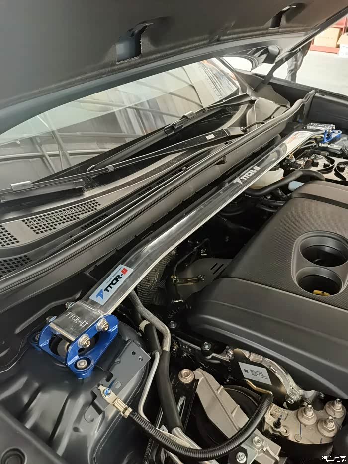 加装了一条顶吧(平衡杆),提升一下车身刚性,如果不是非常激烈驾驶的话,也没什么用处,只是为了打开机盖的时候看起来有内涵一点而已。