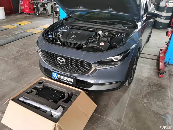 拆保险杠开搞,结果小插曲来了,发现中冷和冷却水壶位置居然不对。其实也难怪,CX30上机械增压就算不是全球首台,也算国内首台了,本想着CX30和昂克赛拉同平台产品,车头和发动机舱特别的像,结果还是有很大的差别,安装只能暂停了。但是我还是要给安若特公司一个大大的赞