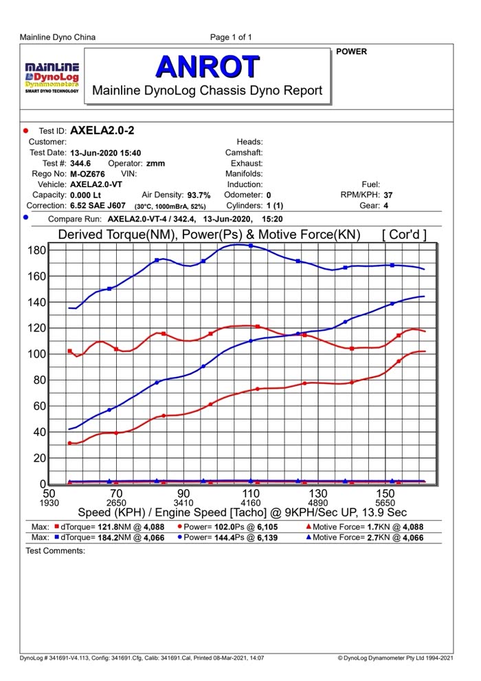 厂家马力机之前做的2.0AT昂克赛拉的马力图(轮上马力),提升了40%,理论上我的MT还多10%以上,毕竟手动挡波箱传动效率是最高的。升级后轮上马力约160匹,扭矩200牛米,换算一下就是超200匹了