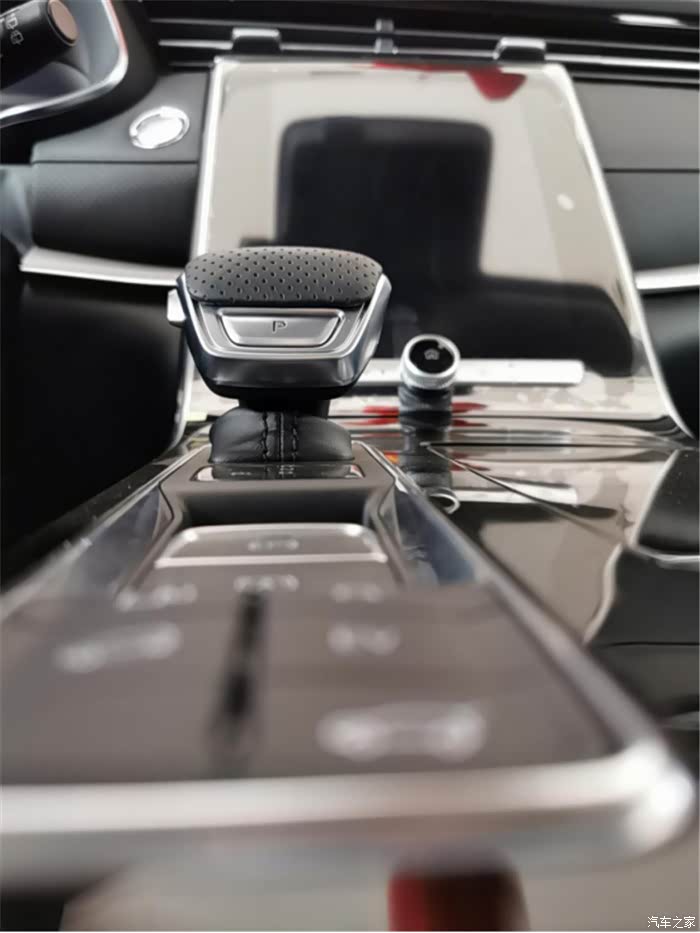 荣威RX5 eMAX的中控台采用了钢琴黑色烤漆材质,飞船式档把符合人体工程学,握感舒适,非常的高级,从这个角度拍,档把是不是非常好看