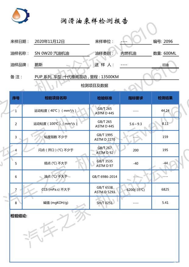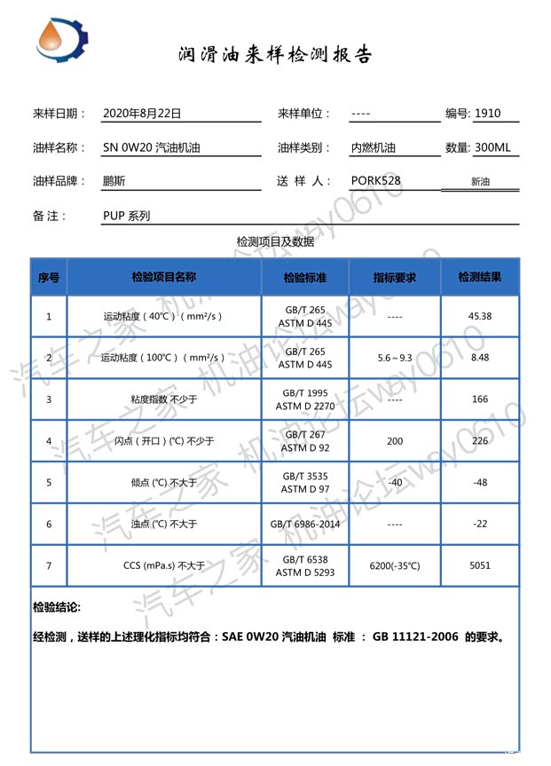 机油送检第290篇-鹏斯PUP 0W-20 13500公里