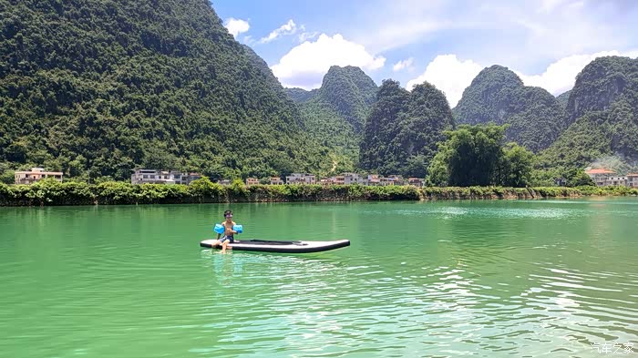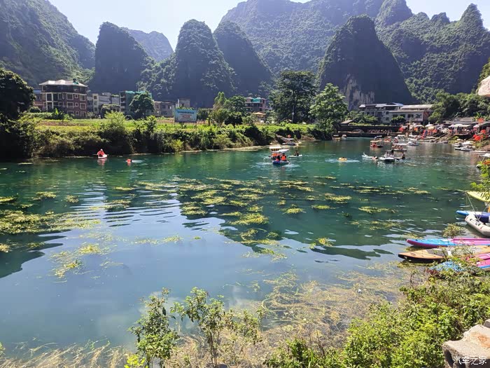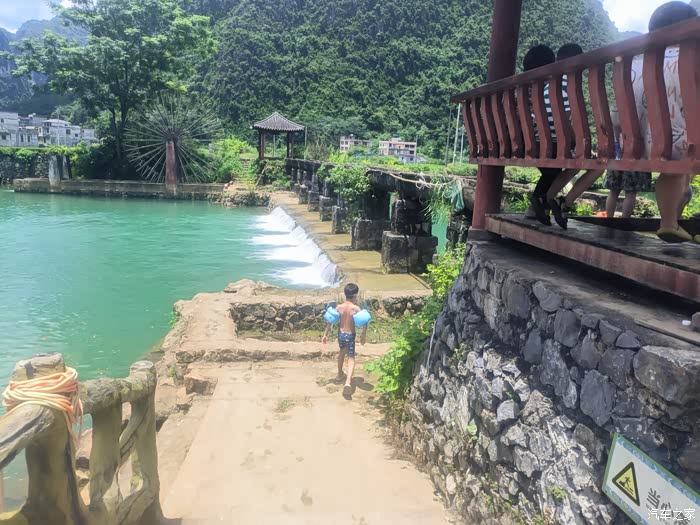 按照路线走 第一到的地方叫弄工渡槽。是个玩划船和跳水的地方。有一个很有特色的渡槽。很适合拍片。因为在玩水的最下游,水质在当地算很一般。(但是也不是其他地方随便一个水可以比的)。当地人有桨船可以出租。(一般是30块钱一小时,50块2小时。租船不多的情况下可以讲价50块钱不限时)。注意!注意!注意!防晒!从这里开始往后的所有广西玩水的地方 都要注意防晒。我和儿子玩了不到2个小时。当天睡觉都只能爬着睡,整个背火辣辣的痛,过几天就开始掉皮了。广西的太阳真不是开玩笑的。个人来说,农工渡槽相对于后面的天窗有几个明显的劣势:1.水质不如上游。2.水比较深,没有浅水区,对不会游泳的人不友好。3.没有任何遮阴的地方,太阳大了有点顶不住。