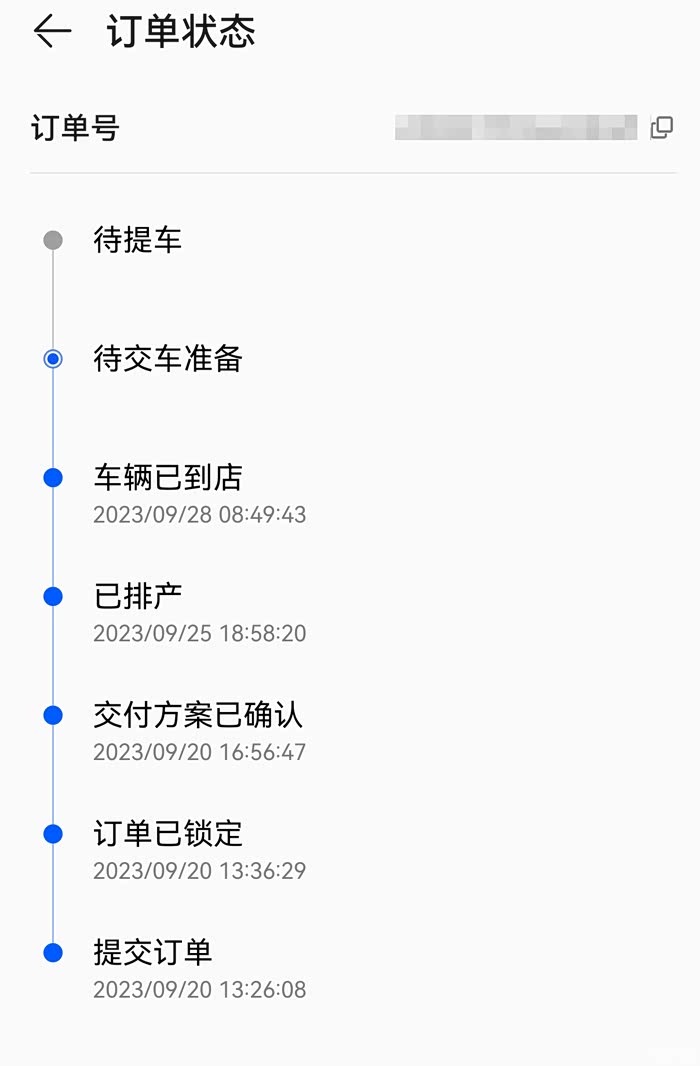 9月20日定的车,销售说估计交车周期在3~4周,原本10月中下旬才能提车,没有想到提前这么早,25日在问界App就显示已经“排产中”,26日就显示“发运中”,27号授权中心店就打电话给我说车已经到了,准备好后28号交车,因当天交车比较多,就给我排到了28日11时58分交车。不过AITO APP信息更新有点延迟,显示的是28号才到店