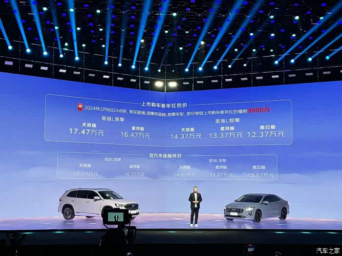 12月3日,从吉利官方了解到,吉利星瑞L智擎和星越L智擎双车正式上市。其中星瑞L智擎提供星云版、星河版和天宫版三款车型,星越L智擎提供星河版和天宫版两款车型。星瑞L智擎的指导售价为12.67-14.67万元,星越L智擎的指导售价为16.77-17.77万元。购车福利方面,2024年2月9日24点前购车用户,可享受3000元购车福利;两款车天宫选装包为2999元;购买星越L智擎可享受NOA智能领航辅助系统2年免费使用权。