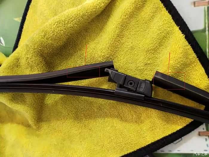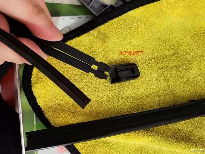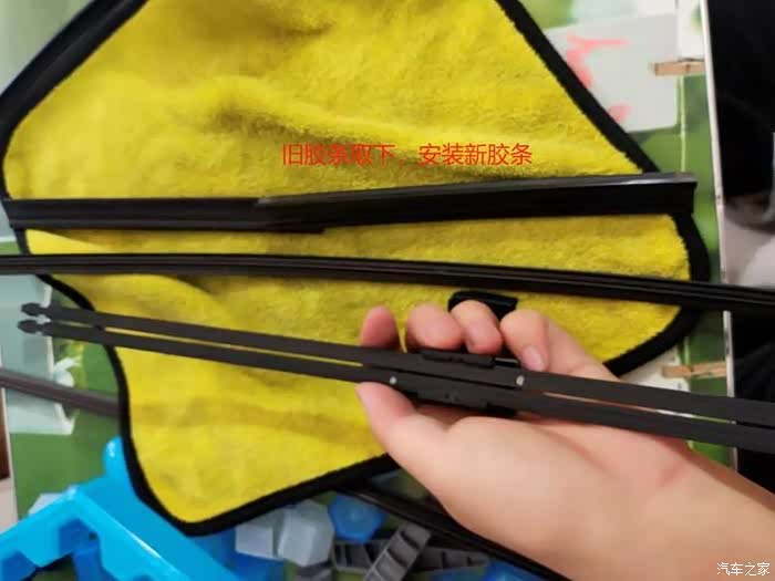 雨刮条和塑料头子已经取下,下面换上新的雨刮条。