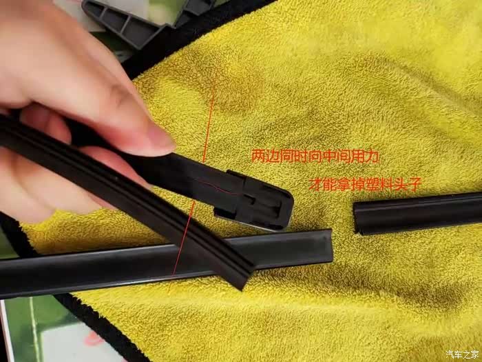 旧的雨刮条抽掉后,按图中箭头的方向,像中间同时用力,将两边钢片的缝隙捏到最小(可以借助老虎钳)随后将头端的塑料头子一拔就扯下来了。