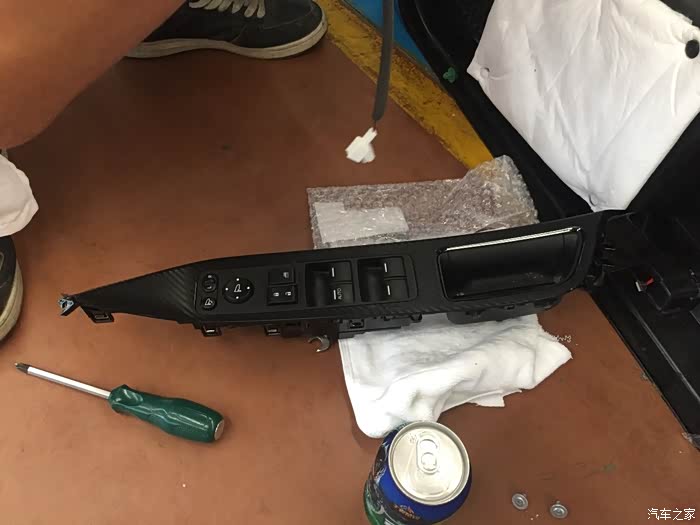 这个主驾控制总成和门板中间原车是有一个装饰带的,需要把它拿下来,换成我们购买的LED装饰带(其实就是在原车的装饰带里面加了一条LED发光带)