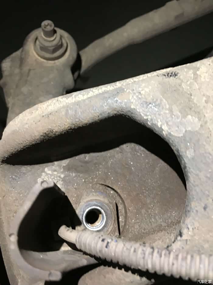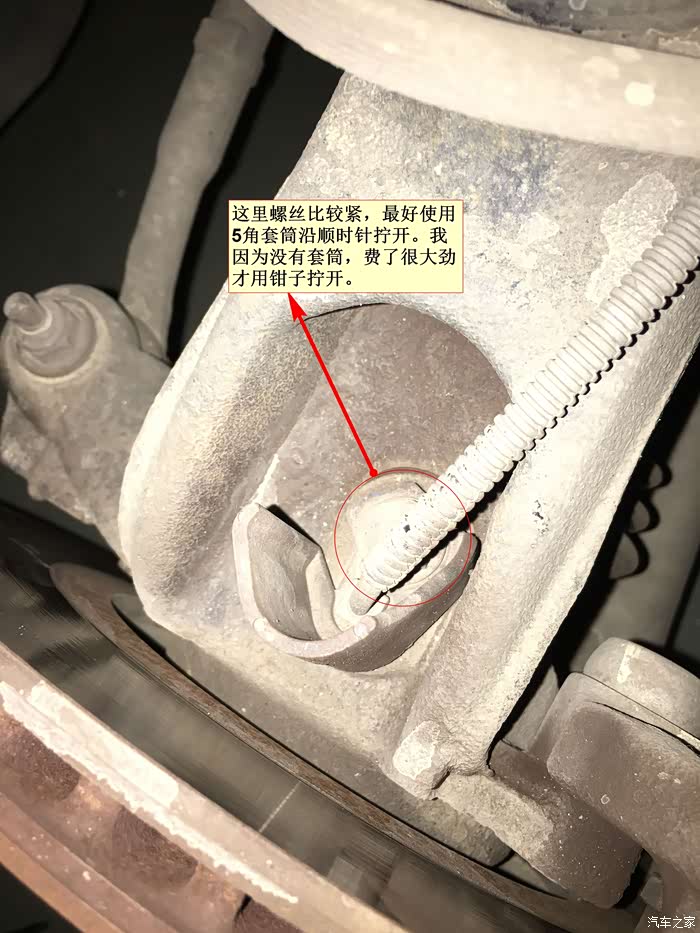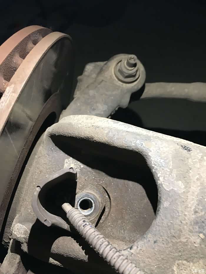 这里就是刹车盘旁边的ABS传感器接口了。螺丝比较紧,最好有直的5角套筒拧开,扳手是无法伸进去的。我用了钳子费了较大力气才拆开。
