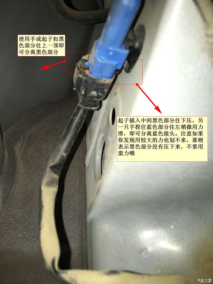 拆掉挡泥板后就漏出接口了,具体拆解请看图片文字说明。这个一定不要用蛮劲,以免损坏附着在车上的吸盘底座。这里仔细摸索了才掌握了正确拆解方法,很快就拆开了。建议先拆黑色部分,再拆蓝色部分。