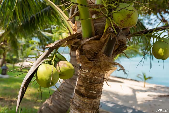 酒店沙滩旁种着一排排椰树,椰子树并不高,伸手可摘的椰子。