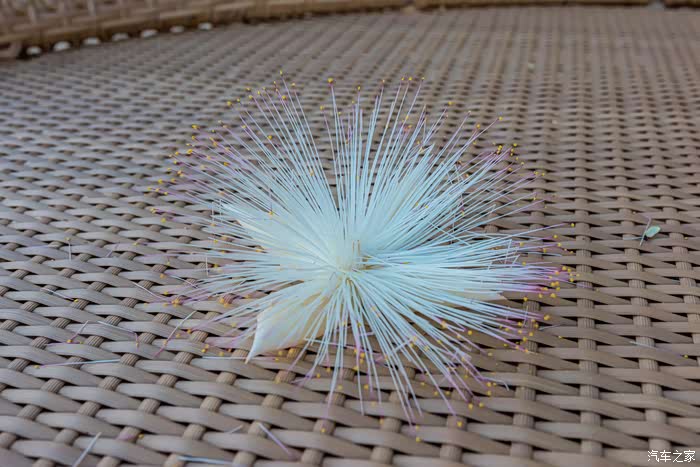 沙滩边的椅子上散落了好多树叶和花,但不知道这个花叫什么名字。