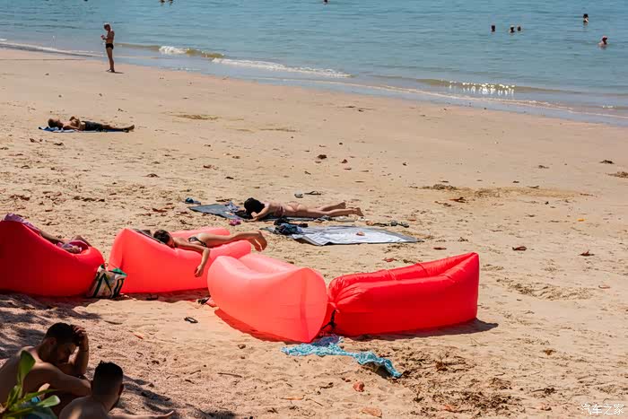 四个红色的气垫床,配了四个漂亮的妹子,他们都不怕晒的,好想上去叫他们四个一起拍个照,但是英语不好这就尴尬了。