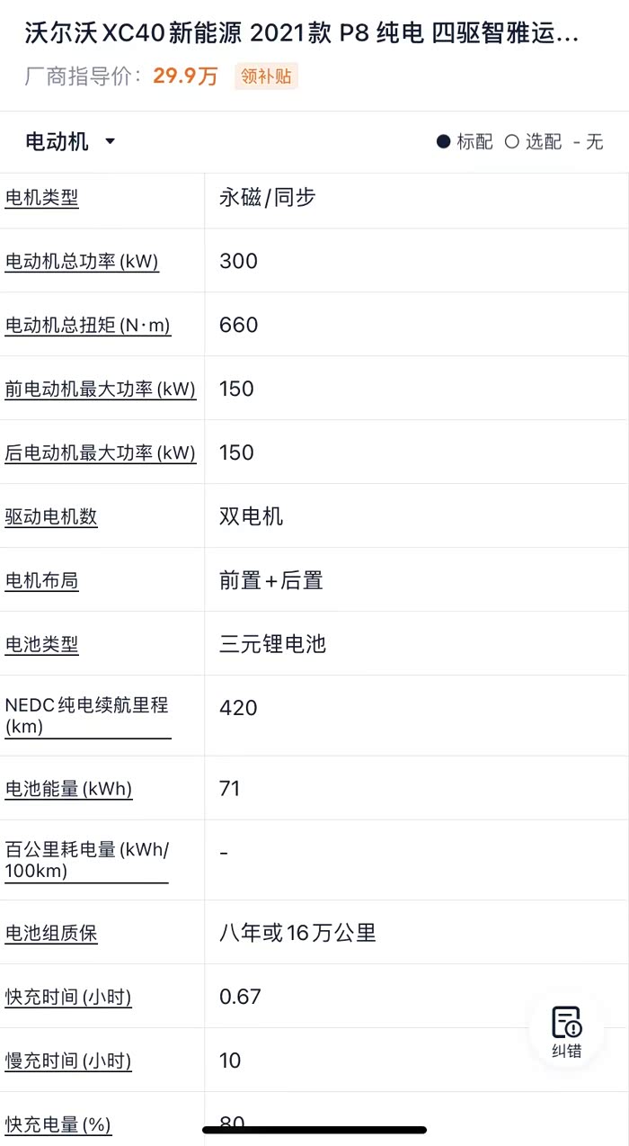 这辆2021款XC40 RECHARE P8纯电四驱智雅运动版,官方续航里程420Km,实测里程在360km左右,拥有408匹马力的前后双电机,5秒内破百真不是吹的!