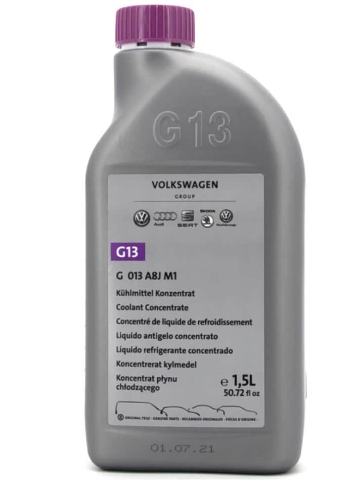 奥迪G13冷却液,淡紫色液体,四代半冷却液。由于将冷却液中20%乙二醇替换为无毒的丙三醇,更为环保,价格较贵。建议替换之前用蒸馏水大循环冲洗干净再进行添加。