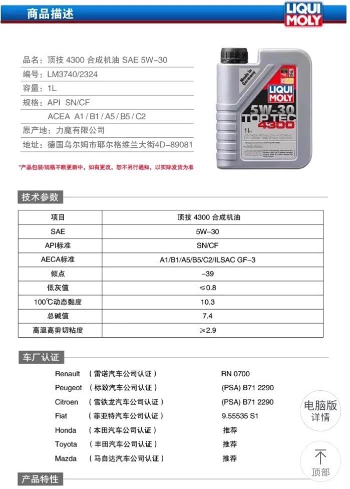 力魔4300 A5B5/C2参数比4200好,4200 12.2粘度偏粘,这款油使用者感受也不错,不过合成型价格贵,性价比较低。