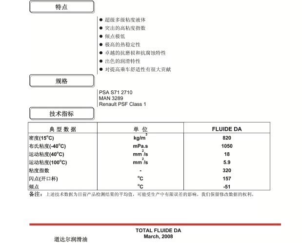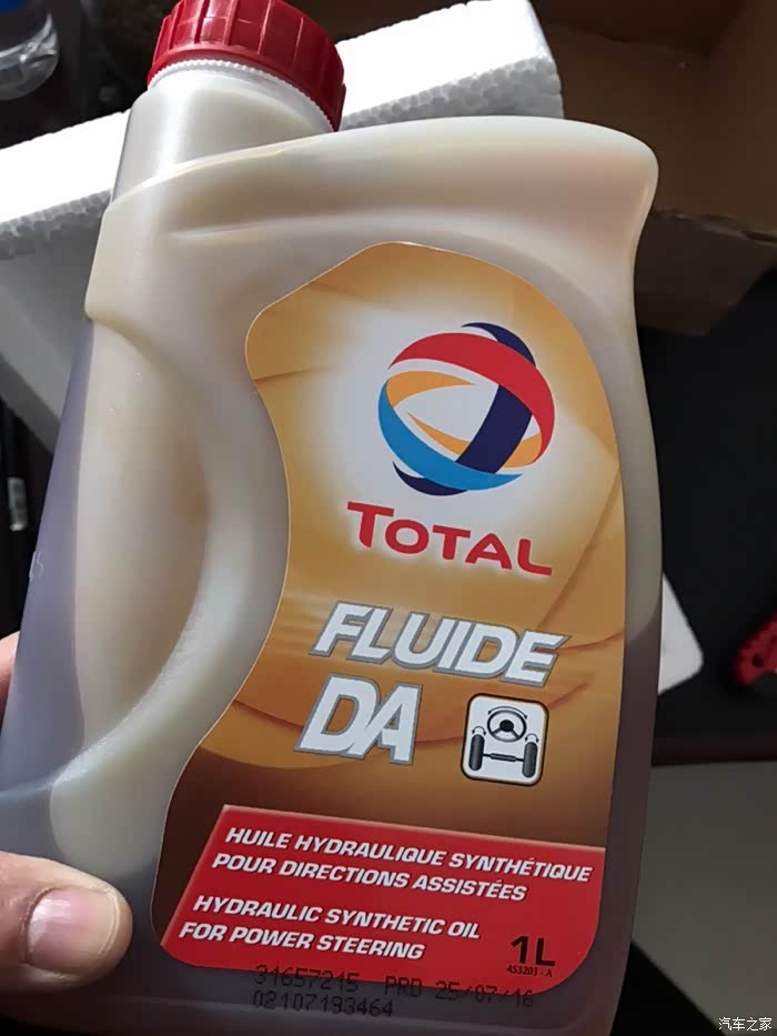 道达尔FLUIDE DA全合成助力转向油,红色液体,合成型版本为LDS。转向油不建议大家使用变速箱油替换,参数差异很大,冷车打方向会造成异常磨损。
