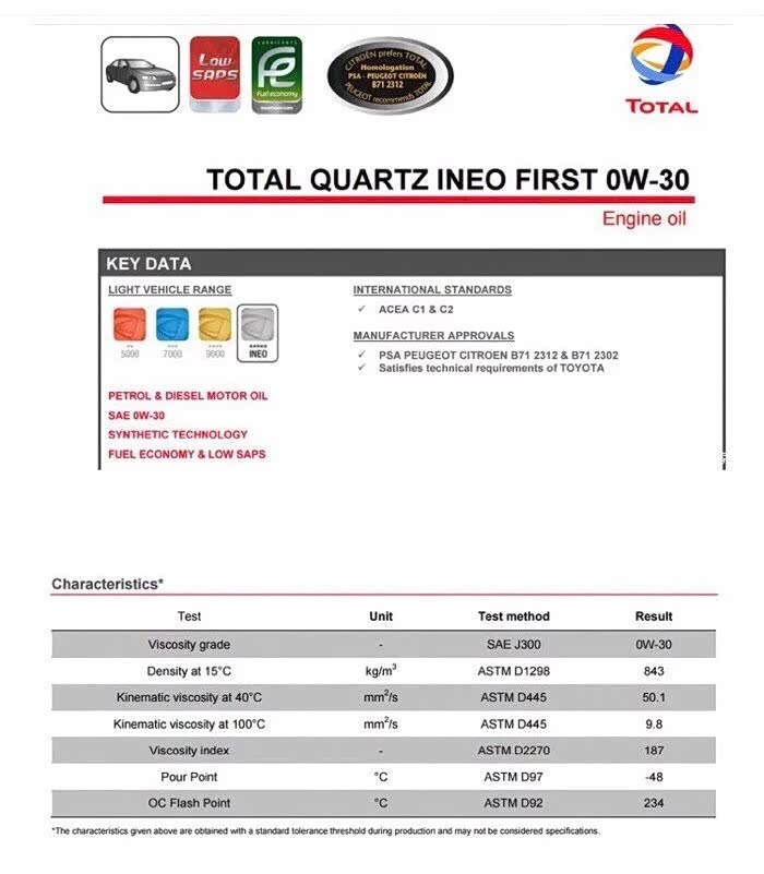 道达尔INEO FIRST 0W-30 C1/C2比福斯那款参数更漂亮,粘度指数高达187,100度运动粘度9.8,基础油PAO含量30-40左右,PSA B71 2312认证,力魔最新款的4310也是这个认证。