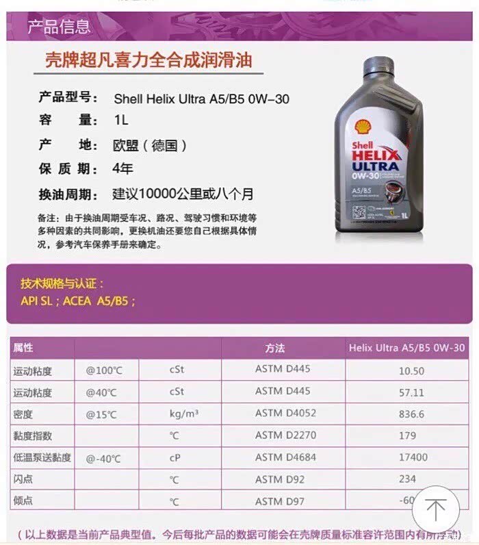灰壳0W-30 A5B5 SL,此油也是天然气技术基础油,各项参数很不错,粘度指数179,最厉害之处在于-60的倾点,适合极寒地区的车友,目前使用感受:声音比EP小,提速方面感觉不如EP迅速。