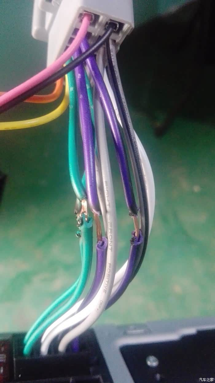 试过机后把接头拆下来接线,找出CD机8根输出线。我的是1.4理想,原车只带前门输出,所以对应找另外4根输出线很简单,一般花线都是负极,打火机烧一下,拉出铜线接口,两根接左后门,两根接右后门
