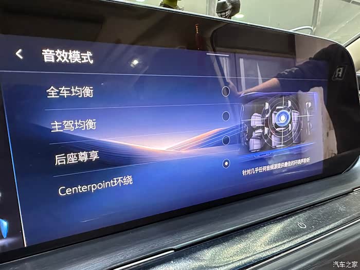 四种模式的第一种:全车均衡,这个模式下全车每一个位置听到的声音是一样的。适合人多的时候。第二个模式是主驾均衡,声场会移动前部,低音发声主要是前部低音氛围浓。第三个模式是后座尊享,充分照顾中排客人的听感。第四种是center point环绕,安静时好好享受一下环绕带来的效果吧!