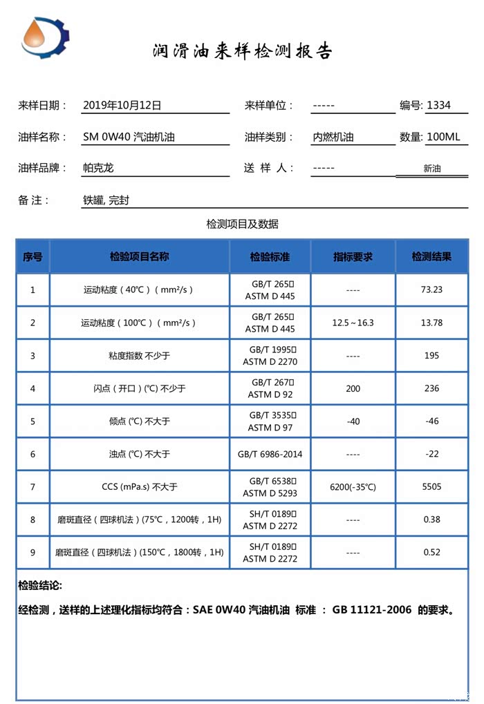 2.40度运动粘度,r74.57,帕73.23,帕克龙更低一些。40度运动粘度理论上越低越好,前提是不要影响蒸发损失和剪切稳定性。