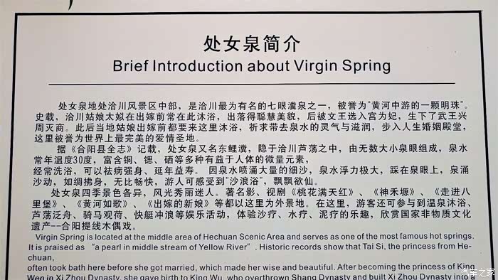 环顾四野,令人心旷神怡,对于远离了喧嚣的城市的人们来说,置身于野趣盎然的处女泉边,确实是难得的人生享受,因而有“不下处女泉等于没到洽川”的说法。