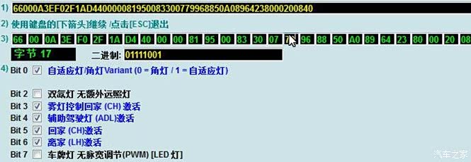 点击字节17,激活伴我回家用雾灯,勾选Bit3;激活离家或回家模式开关点击Bit5,6