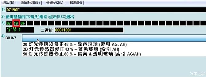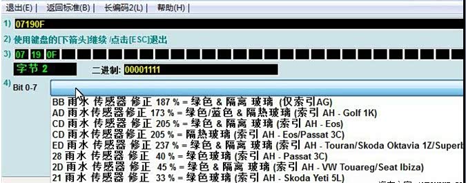 自动大灯灵敏度30(48%)-->19(25%), 图片是19(25%), 试了很多发现10(16%)最合适, 否则下雨自动关窗功能有Bug. 选1--开头的长编码, 然后点长编码帮助, 手动改07190F中间的19那两位