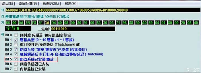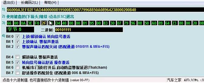 选择字节5,开通锁车声音提示(勾上Bit1),开通解锁报警音,(勾上Bit4)
