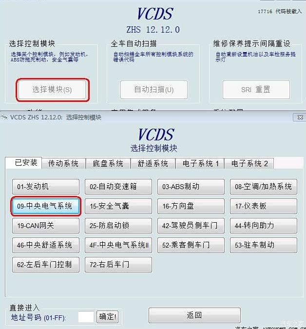 打开VCDS-->选择模块-->09-中央电气系统