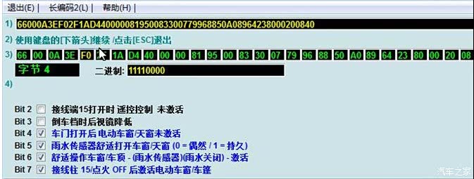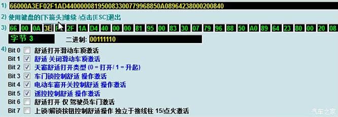 选择字节3,一键开窗时天窗不开,不勾Bit0; 一键开窗时天窗倾斜开启,勾选Bit2