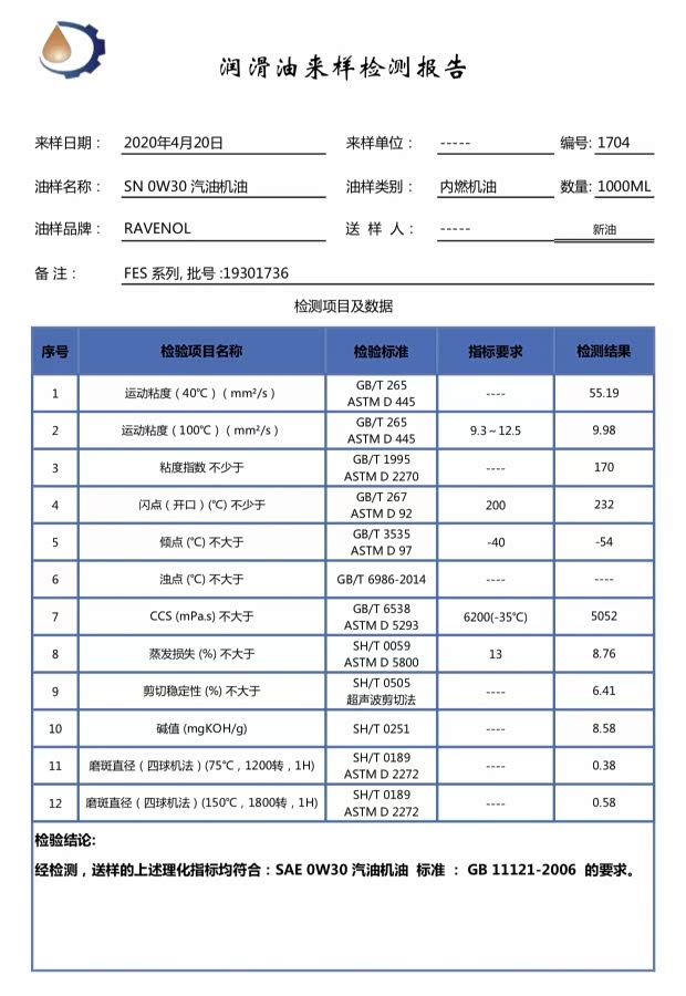 拉锋FES 0W-30新油实测数据
