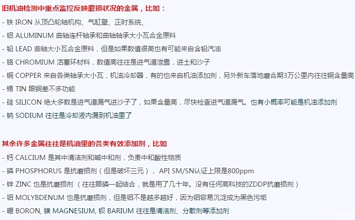 新机油中是没有特定的金属元素的,废油中的铁、铜、铝等元素的多少,直接反应了磨损程度,看一下5000公里的废油中各种元素的含量。