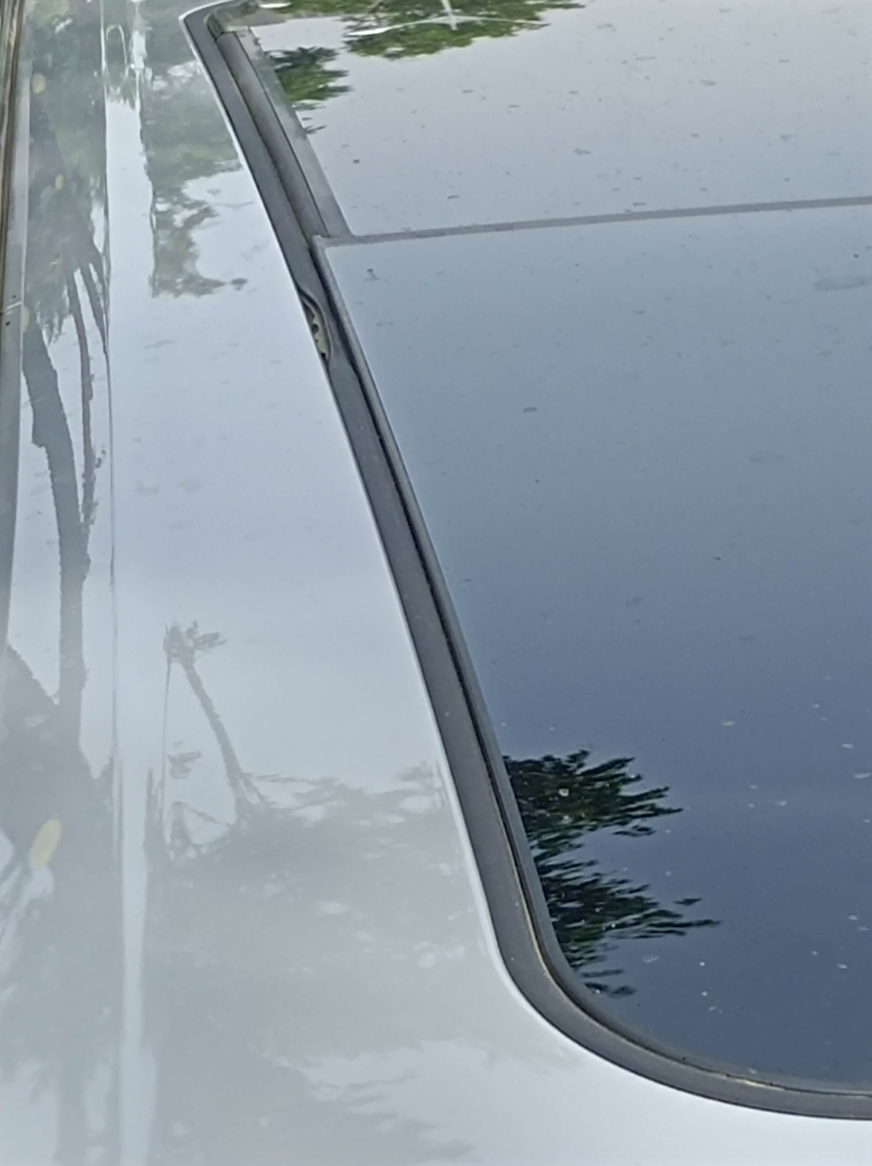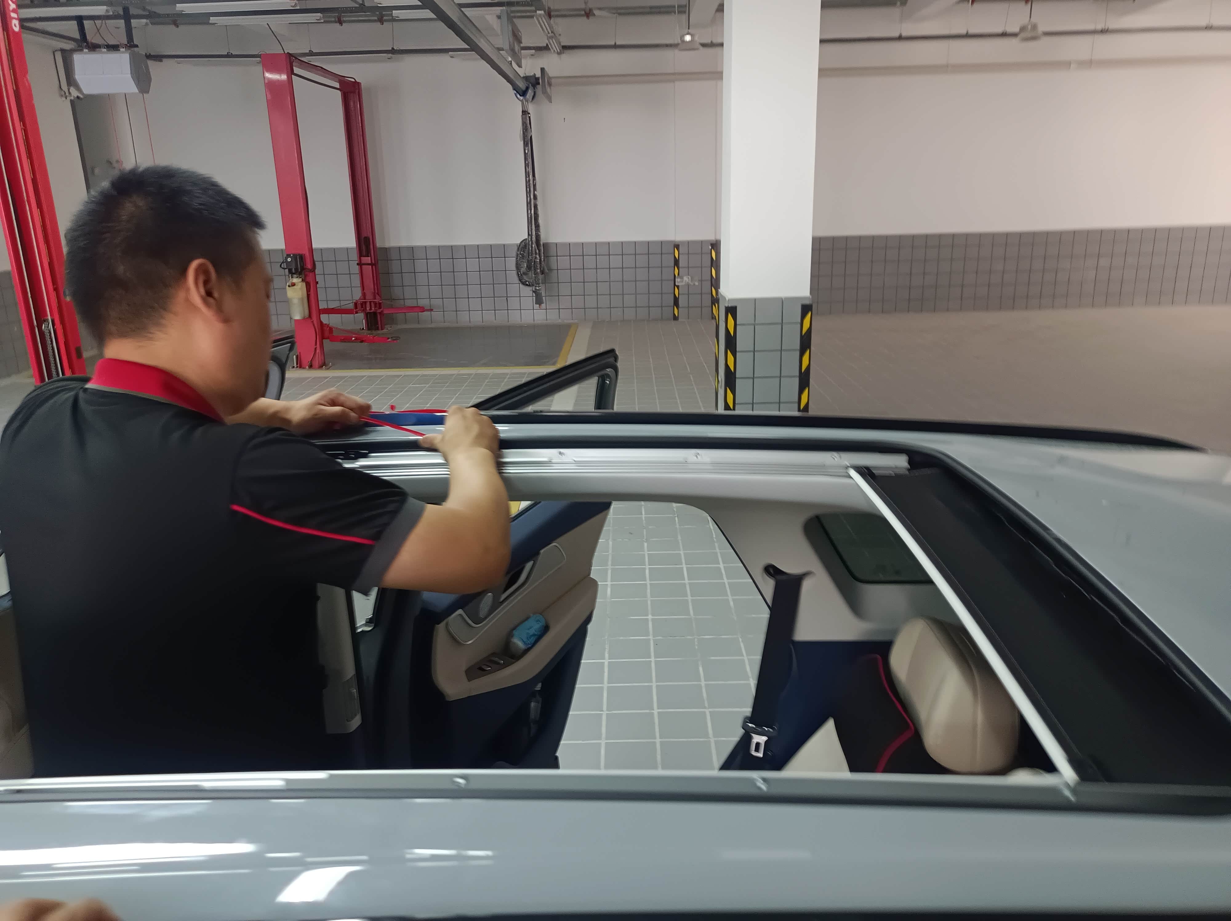 擦下车顶天窗玻璃,登高一看,发现天窗玻璃密封条开胶了,大概有10公分长。心里顿时不爽。。。
